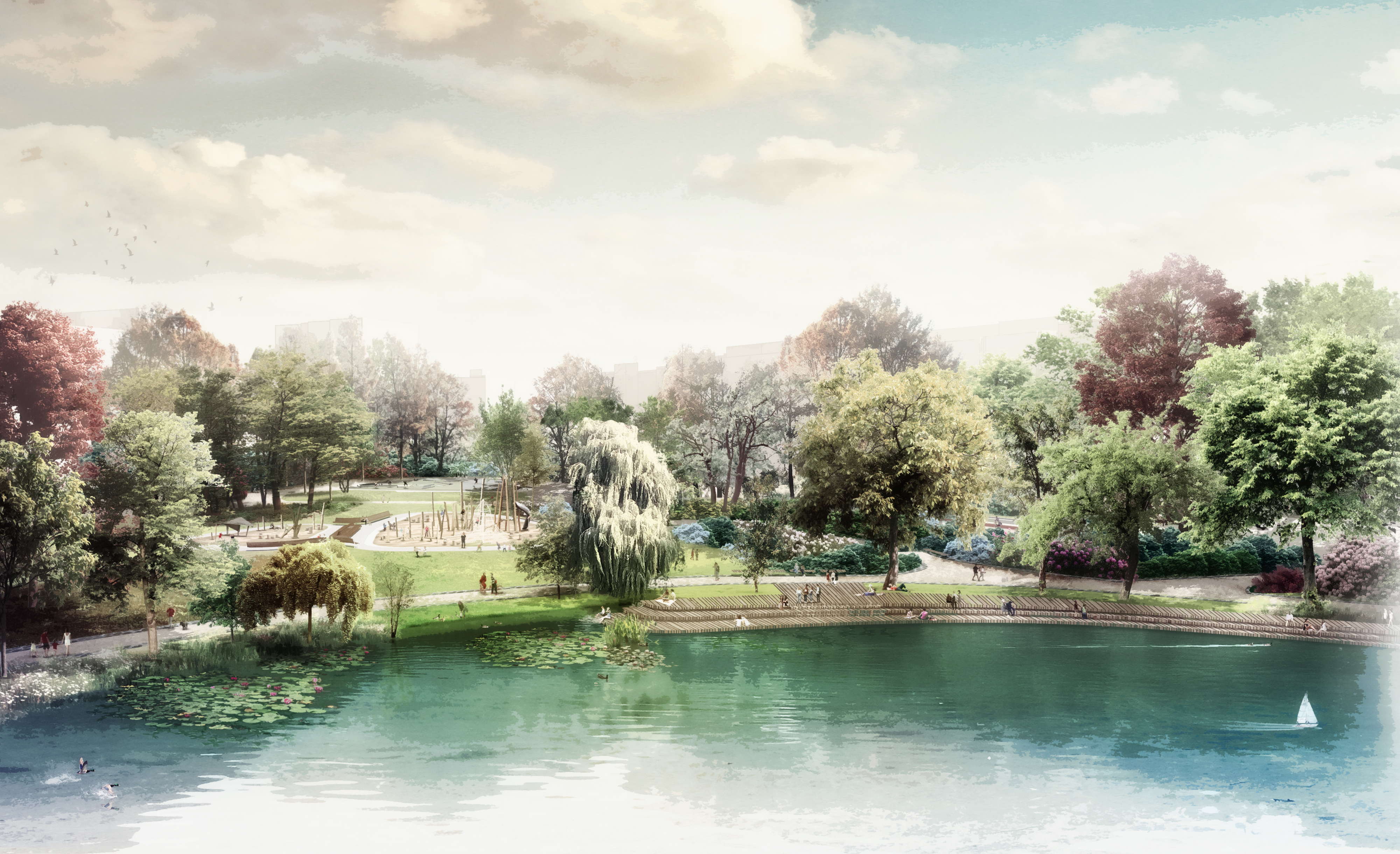 Schepen voor openbaar domein Erica Caluwaerts: “Bij een grote waterpeilstijging in de vijver verkleint de ligweide aan de oever. Om de bezoekers toch ruimte te geven aan de waterrand, komt er een ponton. Dit zal bestaan uit een houten zonnedek in verschillende niveaus. Drie treden met een totaal hoogteverschil van 1,5 meter vormen een tribune. De vormgeving van het ponton sluit aan op de landschappelijke stijl, met haar typerende slingerende serpentinevormen.”
